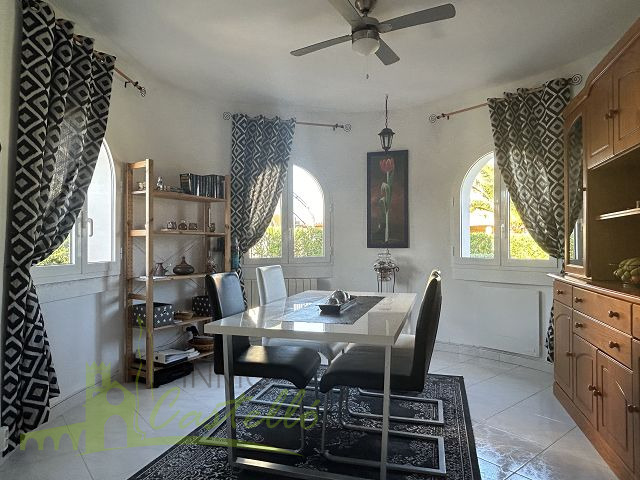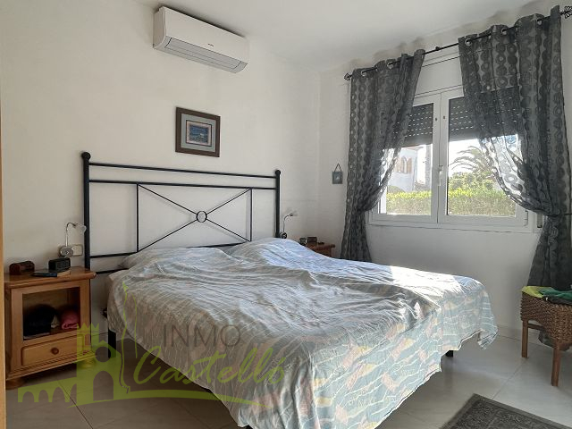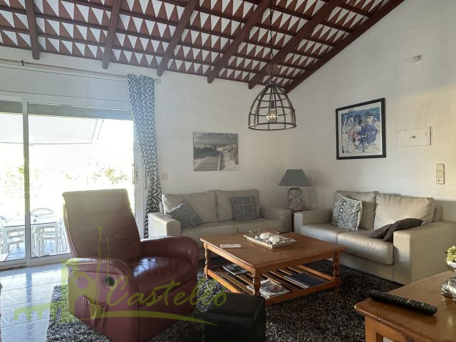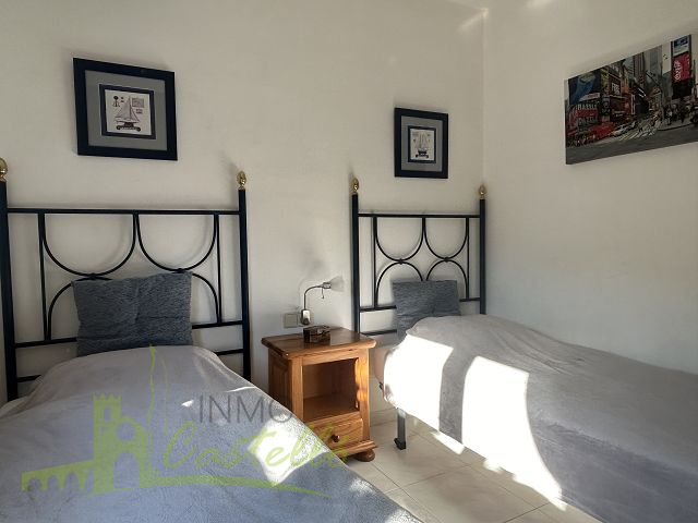 Sie genießen 99 Quadratmeter mit allem, was Sie für Ihren Urlaub unter der herrlichen spanischen Sonne benötigen, und wohnen privat und sicher in den 4 Wänden. Das Erdgeschosshaus ist auf einer Seite Doppelhaushälfte und verfügt über ein eigenes Grundstück von 439 Quadratmetern. Es besteht aus einem Wohn-Esszimmer mit integrierter Küche, zwei Doppelschlafzimmern, einem kompletten Badezimmer mit Dusche, einer Terrasse, einem Abstellraum, einem Carport, vollständig eingezäunten Garten, einschließlich eines Gemeinschaftspools.