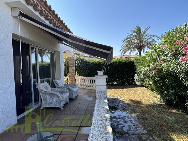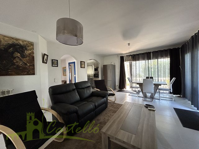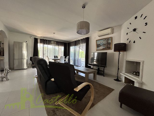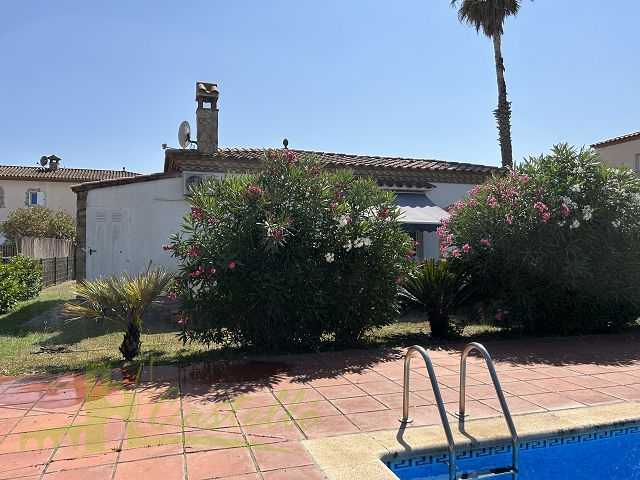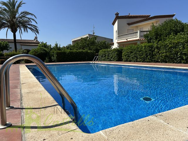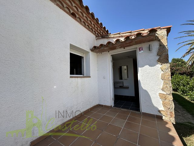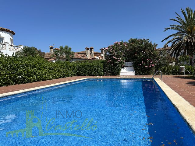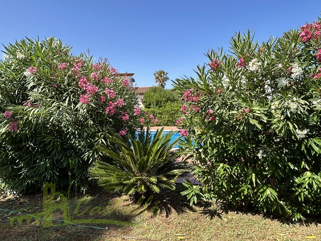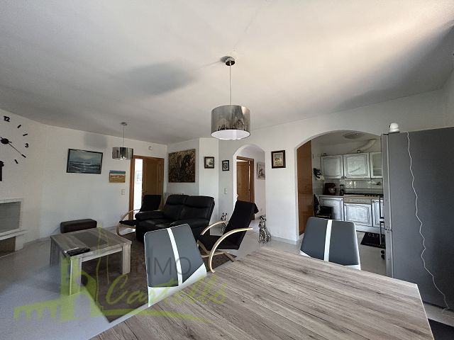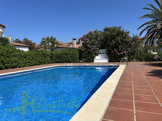 This 107-square-meter house has everything you need for your sunny vacation, set on a 478-square-meter plot. The entrance leads to a generous, light-filled living room with a fireplace and views of the garden and communal pool through large French doors. The large open-plan kitchen is located to the left of the living room. A short corridor leads to the house's two spacious double bedrooms with built-in wardrobes, as well as a full bathroom with a shower. The property also has a separate toilet in the entrance area and a storage room for additional space. The 24-square-meter terrace, which adjoins the living room, overlooks the small garden and communal pool, with enough space for comfortable seating and a barbecue. There is a 20-square-meter garage (6.20 x 3.20) with an electronic gate directly next to the house.